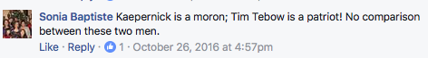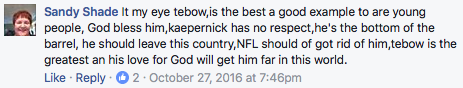 Hayward, J. (2016, Aug. 30). Curt Schilling: Media celebrating Colin Kaepernick vilified Tim Tebow for lowering his head. Brietbart News. Retrieved from http://www.breitbart.com/radio/2016/08/30/curt-schilling-media-celebrating-colin-kaepernick-vilified-tim-tebow-for-lowering-his-head-in-prayer-to-god/