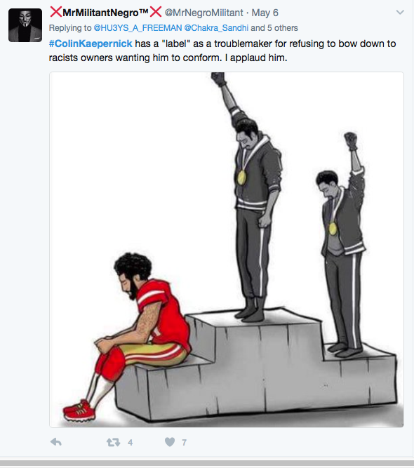 African American history is indeed a dynamic discipline that can be used as a framework to understand the present lives of African Americans as well as the broader American society. As a university professor who values social media as a useful tool in the traditional classroom, I am most interested in using it in my introductory African American history course to make history relevant to my students, especially since a social media post accompanied with a popular hash tag has the ability go viral and reach a wider audience than a traditional academic paper. Many instructors are looking for opportunities to engage students in social and intellectual discourse about history. This article will deconstruct social media posts associated with the hash tag Colin Kaepernick or the like as a teaching strategy to help students enrolled in an introductory African American history course. The idea is to put their learning into practice by encouraging them to actively engage with others on topics relevant to the course content. This article will demonstrate that although the discourse surrounding Kaepernick is polarizing, it is an excellent pedagogical strategy to help students put their learning into practice and engage with a wider audience on topics discussed in an introductory African American history course.